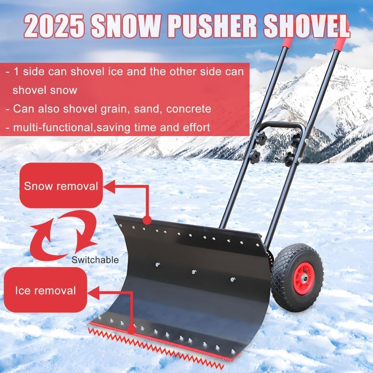 This easy-to-use snow removal tool makes clearing your driveway a breeze, allowing you to push snow effortlessly even in icy weather.Specification:Name: New handheld pusher with wheelsShovel material: High-carbon steelShovel length: 74 in (29.1 in)Shovel width: 42 cm (16.54 in)Shovel thickness: 1.5 cm (0.6 in)Handle length: 100 in (39.4 in)Height: 115 cm (45.3 in)Weight: 14 kgPackage Included:1 × Snow shovels1 × Installation kit1 × Instruction manualWarning:Be sure to keep your hands and feet away from the blades.Be careful when turning around to avoid tripping over the wheels.